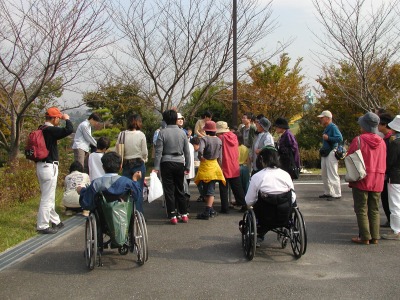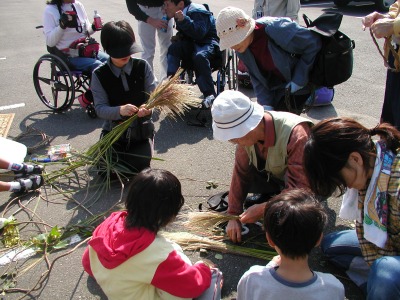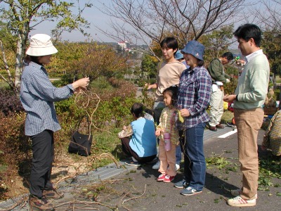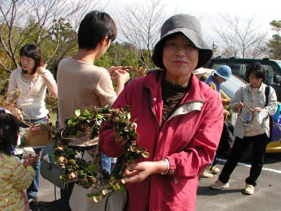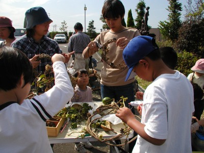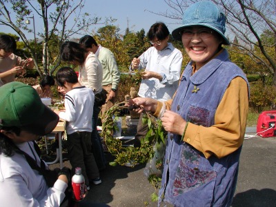 ぽかぽかしたいい天気になりました。阿久比くらしの会、グリーンマップの人達、等たくさんの人に参加していただきました。特に今回は車椅子の方も参加していただきよい交流が出来たことをうれしく思います。いつもより和やかで楽しい観察会ができました。自然からの贈り物を利用し皆さんの協力により、良い作品が出来たと思います。たくさんのお恵みをいただき皆さんと楽しむことが出来る身近な里山をいつまでも残して欲しいと思います。今後も知多自然観察会は体の不自由な方も参加していただく機会をたくさん作っていきたいと思います。これからもぜひお気軽に参加してください。