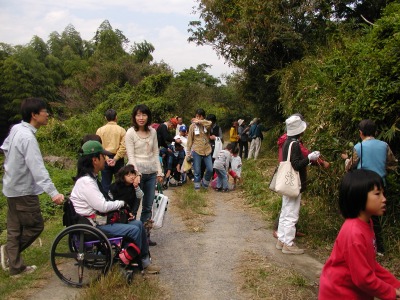 【右】車椅子の方も山道に向かいました。アスファルトとより地面。地面より草原。草原より森。と生き物に会う機会が増えます。