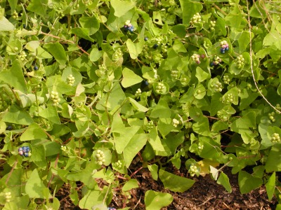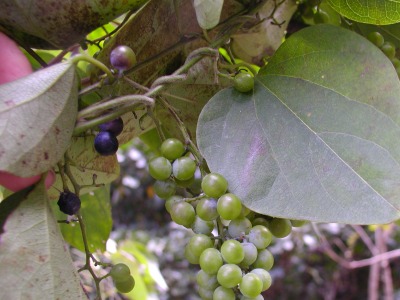 【右】ブドウみたいですね。これはカミエビです。この仲間にツヅラフジがあります。この蔓は工作材料に向いています。何と言ってもこれで葛篭(つづら)をつくったのですから。