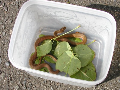 【右】ヘビをペットに連れてきた人がいました。これはやさしいヘビのヒバカリです。元にもどしてあげました。