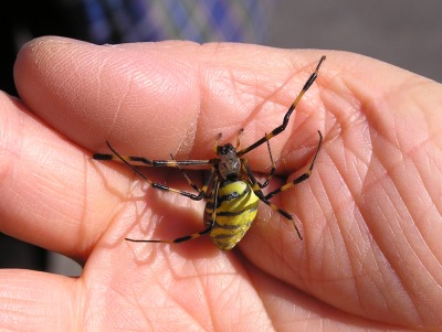 【左】ジョロウグモは成体では冬越しをしません。もう今年最後のジョロウグモでしょうか。クモを恐れていた人も弱々しいクモを手に乗せて記念撮影ができました。