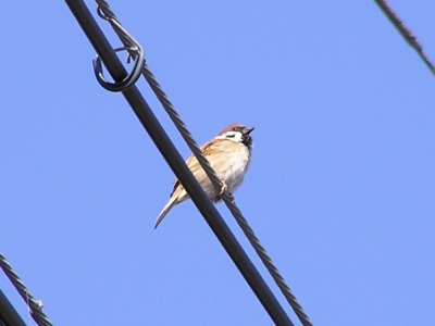 【右】青空の中、スズメが時々、下を見下ろしていました。