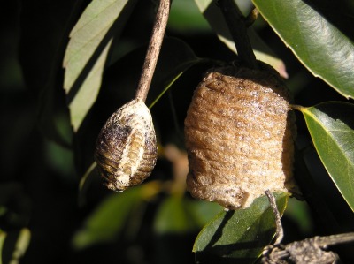 【右】ハラビロカマキリとオオカマキリの卵塊(らんかい)です。林の縁でオオカマキリの卵塊がいくつも見つかりました。