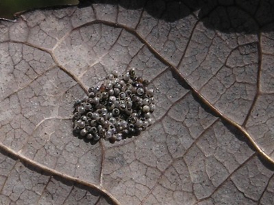 【左】イイギリの落ち葉にたまごの抜け殻みたいなものが付いていました。何か分かる人は教えてください。