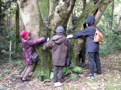 【左】境内に大きなアベマキがありました。二人では足りませんでした。