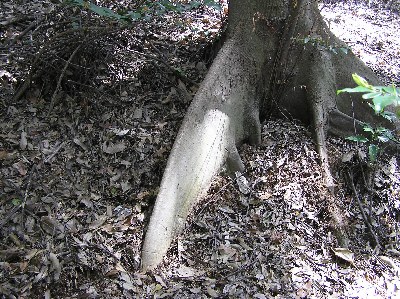 【右】スダジイの板根。土壌が硬く根が張り難いところで発達します。