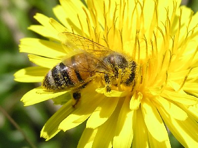 【右】タンポポの蜜をセイヨウミツバチが集めにきました。