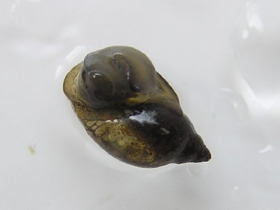 【左】モノアラガイはヒメモノアラガイより少し大きめで、藻類など植物を食べます。