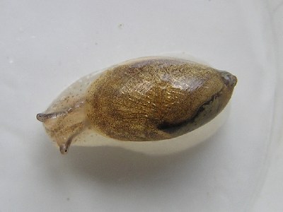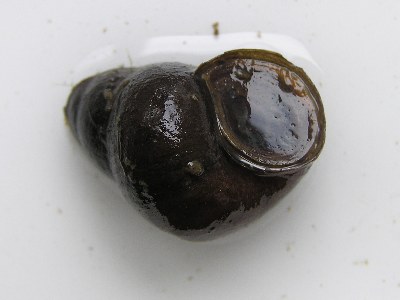 【右】オカモノアラガイです。陸貝の仲間で、水辺の植物の上で見かけます。