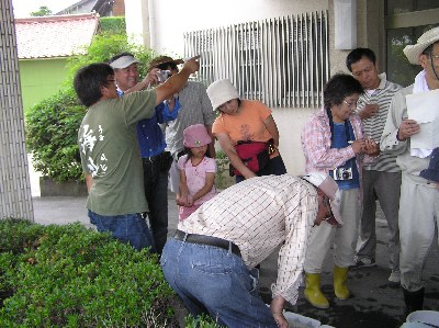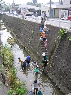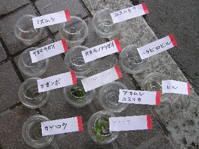 【右】採れた生き物をビンに入れて分かち合いをしています。