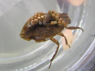 【左】コオイムシのお父さんが卵をおんぶしていました。孵化し始めたのでしょうか。