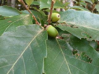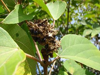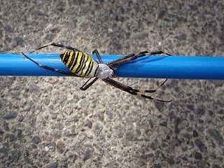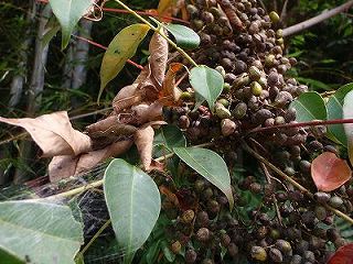 タモ網の柄にとまったナガコガネグモ コナラのどんぐり ハゼの実