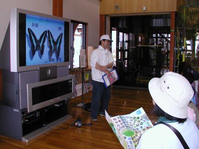 【左】チョウの見分け方についてビデオを使って説明しています。