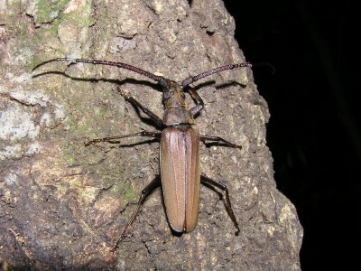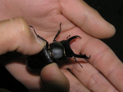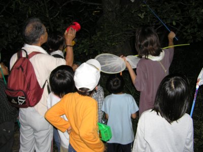 七月の初めが一年で最も日没が遅い季節で、名古屋は19時11分となっています。本日は日没が少し早くなって、19時7分となっていました。参加者の皆さんは、19時に来ていましたので、未だ明るく人の顔を十分確認ができる状態でした。毎年、グランドの西側の森でクワガタを採集していますので、そちらに最初に行きました。しかし、ミヤマカミキリを発見しましたが、クワガタを発見できませんでした。ところが、南川氏は秘密の場所で数等発見してきました。観察会開始して直ぐに、子供たちはゴリヤクをさずかりました。
