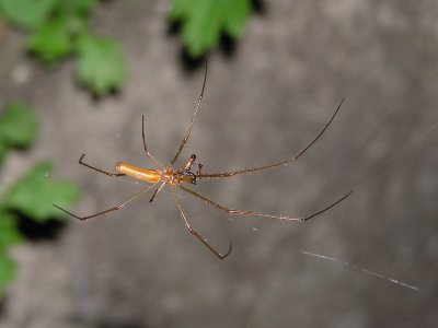 【右】アシナガグモのお父さんです。川から飛び立つユスリカなどを狙って、川や水田に巣を作ります。