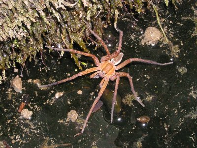 【左】スジブトハシリグモのお母さんでしょうか。サカマキガイとカワニナも写っています。