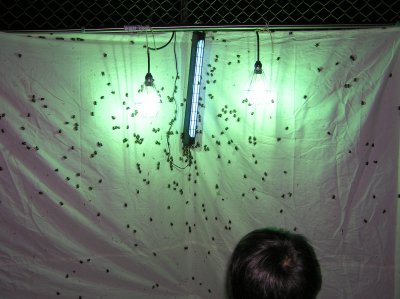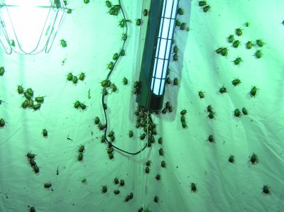 北側からグランドの森を回り、灯火採集している場所に戻ったところ驚く無かれ、写真のごとくカナブンが集団でやって来てました。先月18日の灯火採集の時にカナブンが1,2頭だったのに一月の間にこんなに変化がありました。