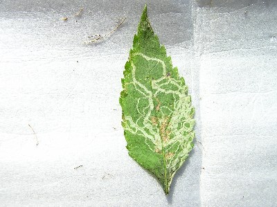 【右】面白い、ハムグリバエの食べ後(別名・字書き虫)