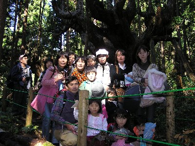 【右】株杉の前で記念撮影。