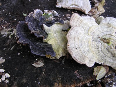 【右】カワラタケ(黒)とアラゲカワラタケ(白)