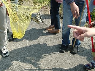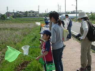 天気がよく気温がぐんぐん上がり暑いくらいでした。地域文化センターから田んぼ道に出ました。生き物活動が活発で、子供たちはチョウを追いかけましたが中ンかつかまりません。大人が手伝って捕まえることができました。ワスレナグサの仲間のキウリグサが可憐の花をつけていました。これを揉んで嗅いだところキウリの匂い、みんなで名前のいわれを納得しました。道の土手で、テントウムシの成虫、幼虫、さなぎ、を同じ場所で見ることができました。小さな子供たちが多かったので、ヨシの葉で草舟をつくったり、カラスノエンドウのさやで草笛を作ったりして楽しく遊びました。