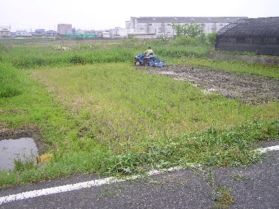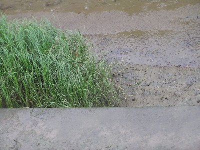 【右】有害雑草の外来植物の一つであるオオフサモが休耕田に生えていました。