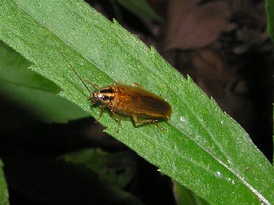 【右】モリチャバネゴキブリがセイタカアワダチソウの葉にいました。
