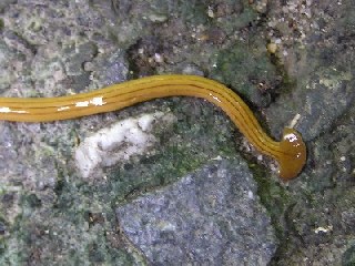 【左】気がついたものをメモをする様に道具を持っています。 【右】神社の石の下から出てきました。扁形動物のコウガイビルです。動物食でナメクジなどを食べます。