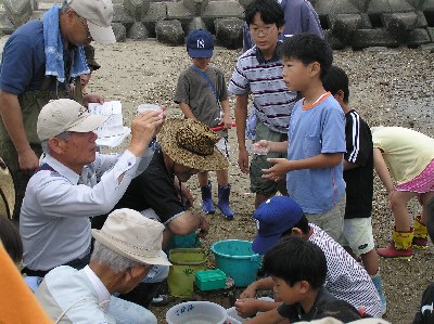 【右】どんな生き物が採集できたか、みんなで分かち合いをやっています。