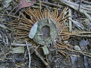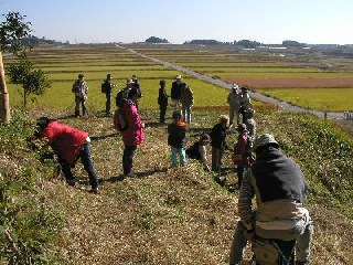 京都・妙心寺のご本尊 大興寺前に集合、町なかだと騒がしく聞こえるヒヨドリの鳴声も穏かで耳障りさが消えるから不思議です。直ぐ裏の自然林は鳥達が運 んで来てくれた種子で見事に常緑・照葉樹林を主体に構成されている昔ながらの丘陵地帯です。本年1月,知多市指定の重要文化財に推挙された樹径80cmはあるシイ の木、その木にはオオタカの巣が残っていました。一方、地形的景観は棚田や溜池の跡があり里山の原風景を髣髴とさせます。このように自然環境良好なところを観察/ 調査し振り返り、分ち合いの後、山本さん、安永さんが手によりを掛けて作った豚汁を皆で美味しく賞味しました。当日の代表的環境事例を紹介しましょう(小川・記)。