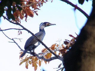 【右】カワウに婚姻色が出て、頭部と腿部(付け根部)に細くて白い羽毛が生えています。目の下も赤いのが分かります。