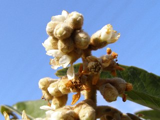【右】ビワの花です。狂い咲きではなく、毎年この時期に咲きます。