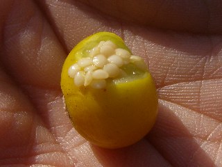 【右】ワルナスビの果実の中です。たくさんの種子が詰まっていました。ナスの仲間ですので種も似ています。