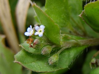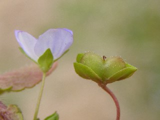 【右】オオイヌノフグリの花と果実です。果実がイヌの陰嚢(ふぐり)に似ているところからです。