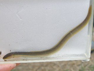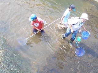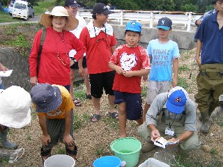 【中】ゲンジボタルのエサとなるカワニナです。これは水質階級U・少し汚い水の生き物となっている指標生物です。なおゲンジボタルは草が茂った土手と川の流れに淵と瀬が有る変化に富んでいると生活でいるかもしれません。