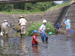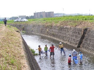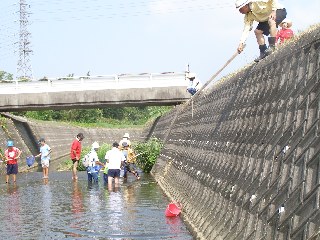 【左】川の土手はコンクリートです。土手が土で、植物が茂っているとよりたくさん生き物が住むことができます。