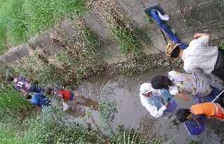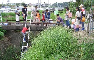 非常に強い台風13号が沖縄の西にありその影響でしょうか、時々パラパラと雨が舞っていました。しかし、大きく崩れそうにないので決行しました。梅の館から観察する現地まで徒歩で移動しました。信濃川は両端がコンクリートの壁で、川に降りるところがないのでアルミのハシゴを使って川に降りました。川は最近浚渫された為、ずいぶん高低差があり、降りるのにチョットした冒険的気分になりました。川底に土がたまった部分があり、そこにマコモが繁茂し、生き物が住み易い環境となっていました。川底の所々が砂質になっていたので、砂質のところが好きなカマツカがたくさん観察できました。水質が良くなっているのでしょうか、石の下できれいな水に住むウズムシを観察しました。また、それぞれ違う環境に住んでいるタイコウチとヒメタイコウチを観察することができました。