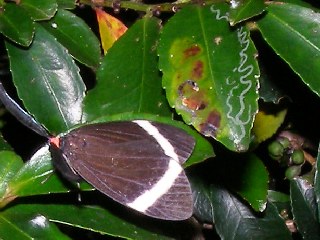 【右】ヒサカキにホタルガが止まっていました。食草はヒサカキです。葉の白いクネクネの線は、ハモグリバエ(ジカキムシ)の仕業です。