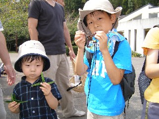【右】イヌマキで手裏剣を作ってもらいました。「ぼくはアメリカザリガニを捕まえたよ」