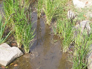 【左】公園の水路に黒米が植えられ、水路にメダカがたくさんいました。