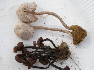 【左】カレバキツネタケ。黒い物は乾燥した物。動物が尿をしたところに発生します。