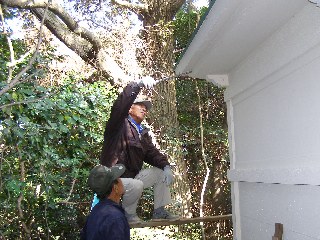 【中】日長神社の氏子の皆さんが塀を修理していました。
