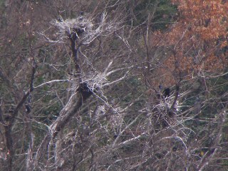 【左】営巣しているカワウ。  【右】枝が白いのはカワウの糞。