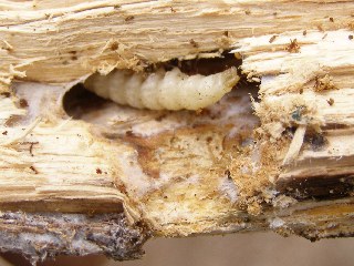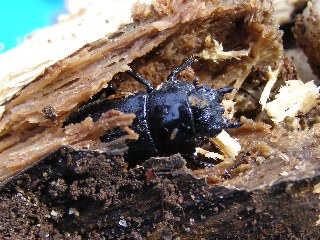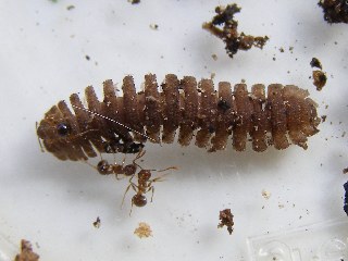 【左】カミキリムシは横に広い穴を作ります。 【右】ヤスデの仲間とアミメアリでしょうか。