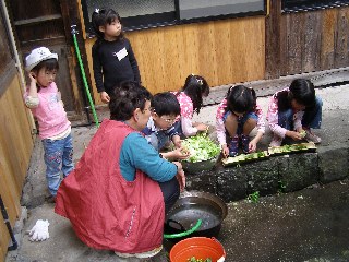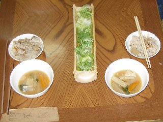 【左】レタスの盛り付けのお手伝いをしています。【右】タケノコご飯とタケノコ汁を頂いています。