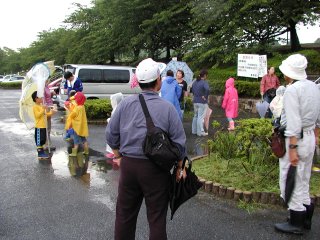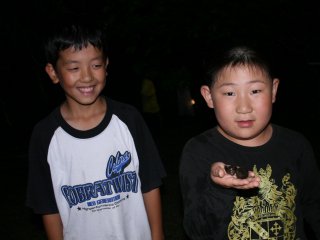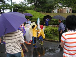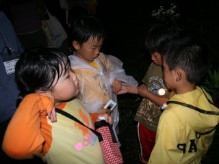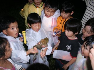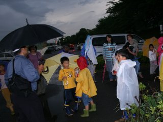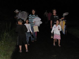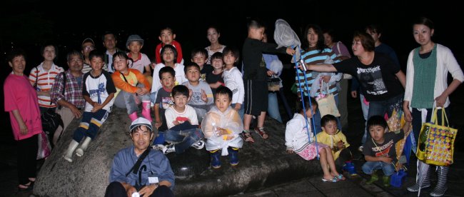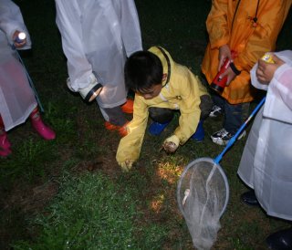 小雨でしたので灯火観察は中止し、旭公園の中をナイトハイクをしてヘイケボタルが発生する水田に移動することにしました。集まった子供たちは生き物大好きの子ばかりで、草むら、木のm幹など懐中電灯で照らして競って虫さんを探しました。やはり雨の影響でしょうかいつもより見られる生き物は少なかったようです。それでも途中でアメリカザリガニやウシガエルをゲットし楽しい観察が出来たようです。(記・降幡)