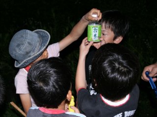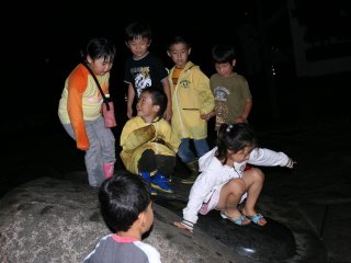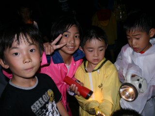 【左】集合時間は夏至で明るかったです。 【右】子供たちは大喜びです。