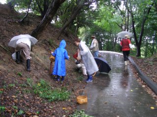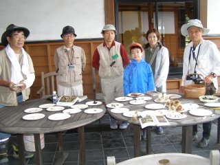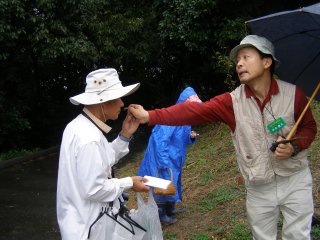 梅の館主催の観察会でしたが参加申込者が少ないということで中止になりました。知多自然観察会としては少雨決行となっているので実施しました。一般参加者は一家族で、我が「知多自然観察会」のホームページをご覧いただき、わざわざ遠い豊田市からの参加でしたした。はるばる知多市まで駆けつけていただいただけにキノコの観察に熱心で担当の降幡より同定能力があり教えられることがたくさんありました。