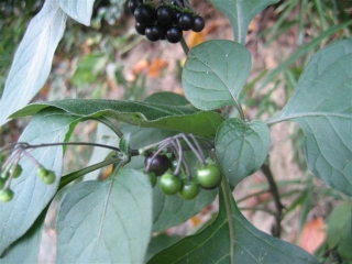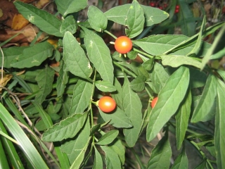 【左】出発後しばらくして生け垣のたもとでマンリョウが迎えてくれました【右】鮮やかな緑色の実をつけているイヌホウズキです