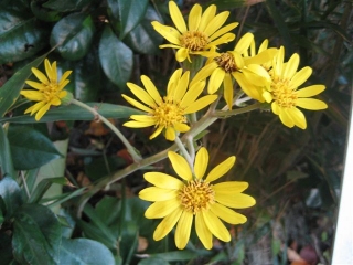 【左】園芸植物にもなっているお馴染みの野生のツワブキ。黄色と濃緑色の艶のある葉っぱとのコントラストが絶妙です